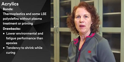 Acrylics are the newest category of structural adhesive, and they can be described as production-friendly for three reasons. One, for a given amount of open time they cure or build strength very rapidly. Two, they tend to be relatively tolerant of oily surfaces, which can mean less surface prep because you may not have to clean oils off. Three, they are good thermoplastic bonders, so you can get very good strength on thermoplastics. With certain acrylics you can even bond LSE polyolefin materials without having to do any plasma treatment or priming. Some drawbacks: acrylics are not going to have quite the environmental or fatigue performance that an epoxy will have, and they also tend to cure-shrink quite a bit more than epoxies. That can be an issue with certain types of joint designs, particularly constrained joints such as the shaft of a golf club going into the club head.