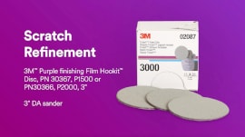 First, locate the paint defect that needs to be removed. Attach a 3-inch 3M™ Purple Finishing Film, Hookit™ P1500 or P2000 grade disc to a 3-inch dual action sander. A soft interface pad is recommended but not required.