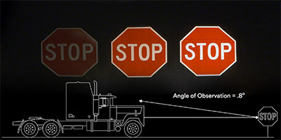 This demonstration shows how 3M's microprismatic fluorescent sheeting can significantly improve critical sign visibility during nighttime conditions. The larger cone of retroreflection illustrates how drivers of both large and small vehicles are better served by Diamond Grade DG³ sheeting.
